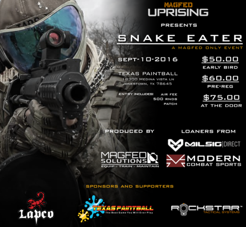 OP:Snake Eater Sep 10, 2016 Texas Paintball Registration Attendees: Dan "Mayhem" Tecson Dave "Tex" Tecson Dillon "Rabbit" Tecson Isaac "Taps" Gonzales Santiago "Pyro" Cortez Marcus "10k" Lovito Scott "Jango" Jarquin NJ "King Klotz" Patel Laurie "Maz" Jarquin